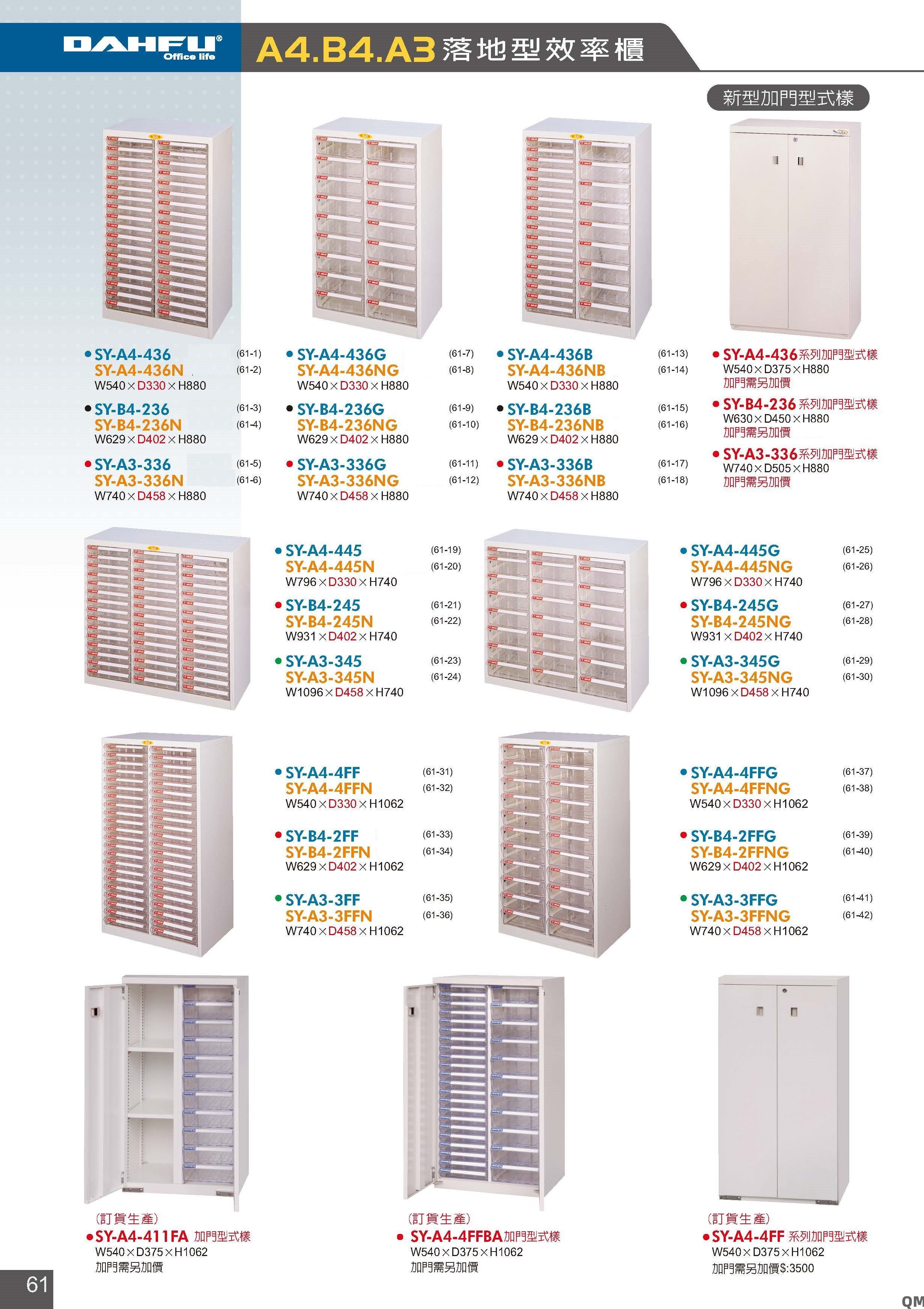 <<返回上一页 A4、B4、A3落地型效率櫃-2 发布时间:2022-04-19 11:24:48点击: ◆抽屜有便簽貼紙設計可標示,可整齊分類◆收納好幫手,可增進工作效率適合居家辦公收納◆抽屜有A4、B4、A3多種尺寸,可分類放置文件與零件